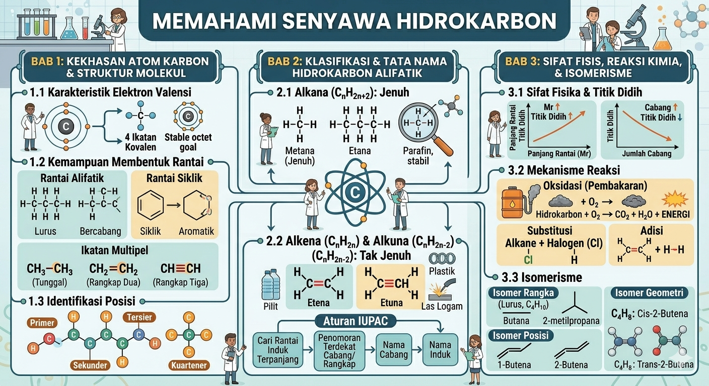 Hidrokarbon adalah senyawa organik sederhana yang hanya terdiri dari atom karbon (C) dan hidrogen (H), yang terikat bersama membentuk kerangka senyawa. Senyawa ini umumnya berasal dari bahan bakar fosil seperti minyak bumi dan gas alam, serta berfungsi sebagai komponen utama bahan bakar (bensin, LPG) dan bahan baku industri petrokarbon.