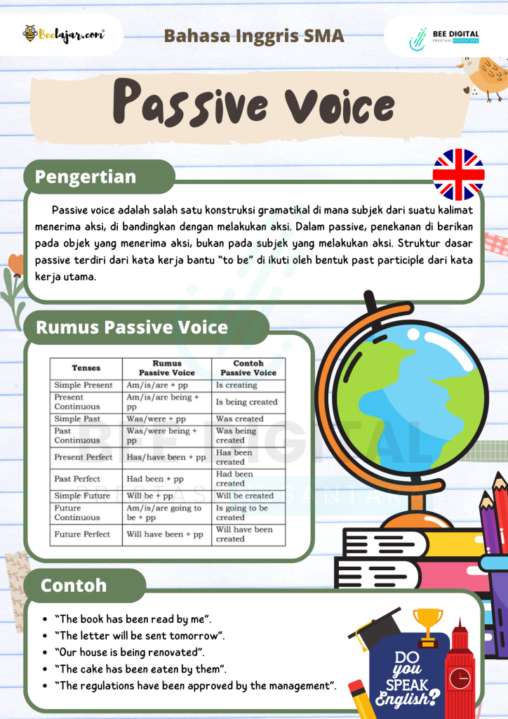 Passive voice adalah kalimat yang subjeknya mengikuti suatu tugas atau tindakan dengan kata kerja, artinya bukan subjek yang melakukan tindakan tersebut. Dalam bahasa Indonesia, kata kerja pasif biasanya diawali dengan akhiran ter- atau di-, seperti melempar, memukul, dan sebagainya.
