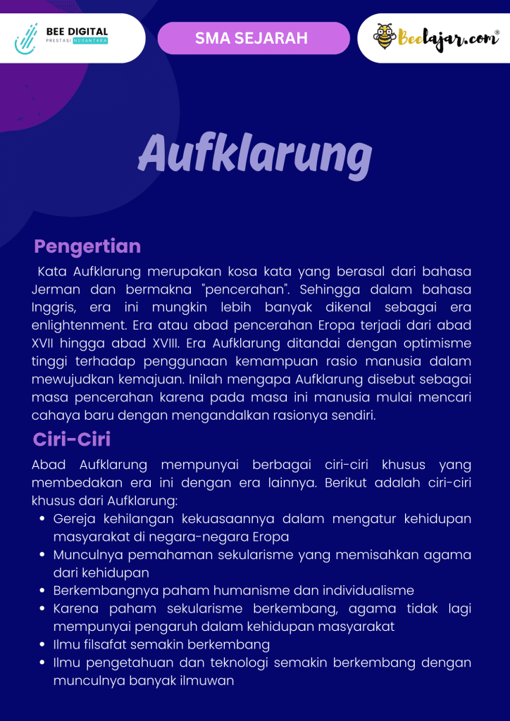 Aufklärung adalah istilah Jerman yang berarti “pencerahan.” Pada abad ke-18, Aufklärung merujuk pada gerakan intelektual di Eropa yang berfokus pada penggunaan akal (rasio) sebagai dasar untuk memahami dunia, menggantikan dogma atau kepercayaan tradisional. Gerakan ini menandai peralihan dari pemikiran abad pertengahan menuju era modern.