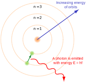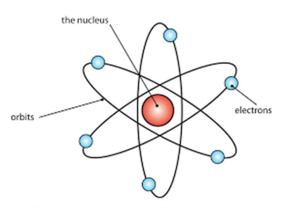 Menurut Niels Bohr, atom terdiri atas inti atom yang bermuatan positif, sementara elektron bergerak mengelilingi inti atom pada lintasan-lintasan tertentu berdasarkan tingkat energi yang tertentu juga.