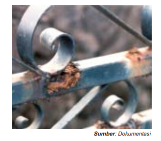 Amati pagar besi yang dicat dan bagian yang mengelupas catnya. Bagaimana permukaananya? Bagian yang mengelupas catnya, berwarna cokelat dan permukaannya berlubang-lubang atau keropos. Perubahan pada besi ini disebut perkaratan.