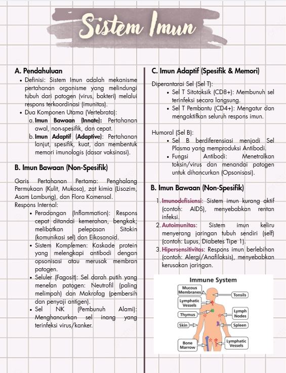 Sistem imun adalah jaringan kompleks dari sel, organ, dan molekul yang berfungsi melindungi tubuh dari infeksi dan penyakit. Sistem ini bekerja dengan mengenali dan menyerang patogen seperti bakteri dan virus, serta sel abnormal seperti sel kanker. Sistem imun memiliki dua cabang utama: sistem imun bawaan (alamiah) yang merupakan pertahanan pertama, dan sistem imun adaptif (diperoleh) yang memberikan respons lebih spesifik dan ingatan jangka panjang terhadap patogen yang pernah menyerang.