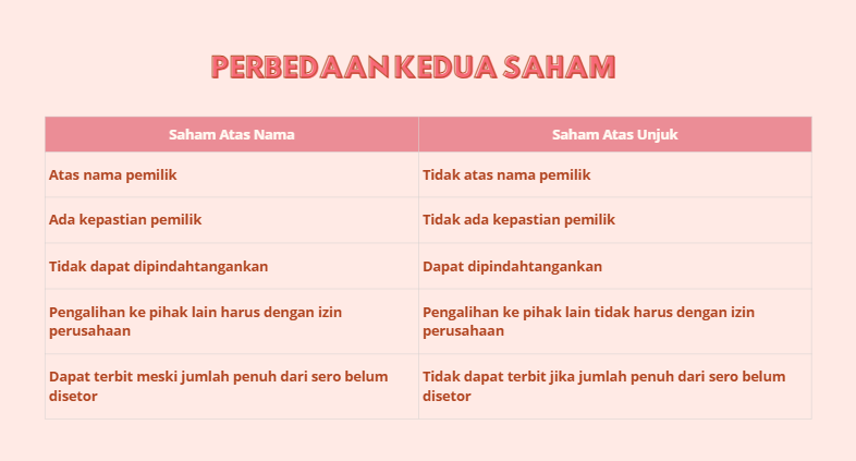3. Jelaskan perbedaan antara saham atas nama dan saham atas unjuk.