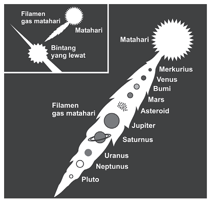 Teori ini dikemukakan oleh James H. Jeans dan Harold Jeffres pada tahun 1919. Menurut teori ini ratusan juta tahun yang lalu sebuah bintang bergerak mendekati matahari dan kemudian menghilang. Pada waktu itu sebagian massa matahari tertarik dan lepas. Bagian-bagian yang lepas kemudian membentuk planet-planet.