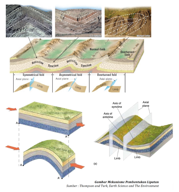 • Lipatan Antiklin: Adalah lipatan yang memiliki bentuk cembung ke atas, menyerupai sebuah busur atau bukit.