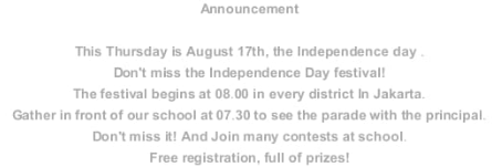 Selain itu, dalam pengumuman tersebut akan ada penjelasan mengenai isinya. Pada bagian ini, akan ada beberapa poin penting. Mulai dari acara (event), tanggal dan waktu (date and time), tempat (place) dan terakhir orang atau alamat, kita bisa meminta informasi lebih lanjut (contact person or address). Penjelasan seperti ini akan menjadi salah satu kunci untuk menyampaikan pesan dengan benar. Karena jika penjelasan kita salah tulis, maka akan merugikan orang lain. Ini tidak seperti itu hanya omong kosong.
