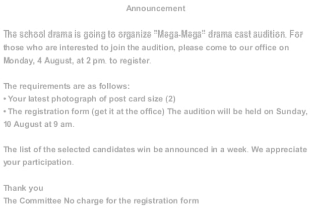 SMA merupakan jenjang sekolah setelah SMP. Pada jenjang ini kita akan mempelajari beberapa materi yang di mana tingkatannya akan lebih jauh dan tinggi. Salah satunya bahasa inggris, kali ini kita akan membahas materi dan soal SMA Announcement. Belajar lebih tentang materi SMA Announcement di bawah ini.