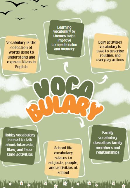 General vocabulary is commonly used in daily communication. Learning vocabulary by themes helps learners understand and remember words more easily because they are connected by context.